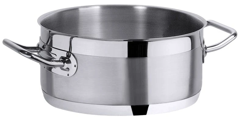 Bratentopf, aus Edelstahl 18/10, seidenmatt gebürstet mit (bis Ø 32 cm hochglänzendem) Schüttrand, verkapselter Sandwichboden, induktionsgeeignet, handliche Vollprofil-Kaltgriffe mit Schutzplatten, extra schwere Qualität