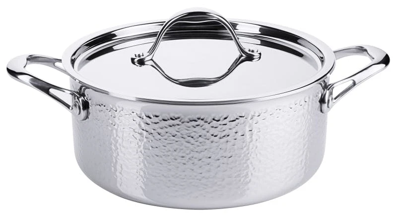 Bratentopf, Hammerschlag, aus Mehrschichtmaterial mit Edelstahl 18/10, hochglänzend, induktionsgeeignet, in Hammerschlag-Optik, mit Griffen und Deckel aus Edelstahl, mit Schüttrand