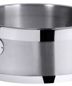 Bratentopf, aus Edelstahl 18/10, seidenmatt gebürstet mit (bis Ø 32 cm hochglänzendem) Schüttrand, verkapselter Sandwichboden, induktionsgeeignet, handliche Vollprofil-Kaltgriffe mit Schutzplatten, extra schwere Qualität
