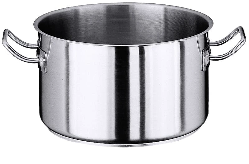 Bratentopf, flache Form, aus Edelstahl 18/10, matt poliert, mit Kaltgriffen und Schüttrand, 7 mm Sandwichboden, induktionsgeeignet bis einschließlich Ø 45 cm, schwere Qualität