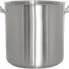 Bratentopf, aus Edelstahl 18/10, seidenmatt gebürstet mit (bis Ø 32 cm hochglänzendem) Schüttrand, verkapselter Sandwichboden, induktionsgeeignet, handliche Vollprofil-Kaltgriffe mit Schutzplatten, extra schwere Qualität