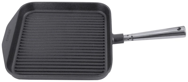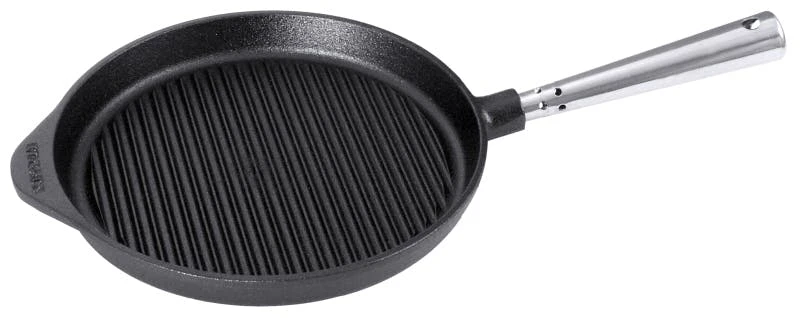Grillpfanne, rund, aus Gusseisen, stark gerillte Bodenfläche, mit Griff aus Edelstahl 18/10, schwere, hochwertige Qualität