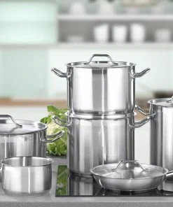 Kochtopf, hoch, aus Edelstahl 18/10, seidenmatt gebürstet mit (bis Ø 32 cm hochglänzendem) Schüttrand, verkapselter Sandwichboden bis Ø 32 cm, induktionsgeeignet, handliche Vollprofil-Kaltgriffe mit Schutzplatten, schwere Qualität