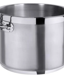 Kochtopf, niedrig, aus Edelstahl 18/10, matt poliert, mit Kaltgriffen und Schüttrand, 7 mm Sandwichboden, induktionsgeeignet bis einschließlich Ø 45 cm, schwere Qualität