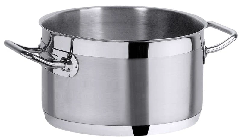 Kochtopf, niedrig, aus Edelstahl 18/10, seidenmatt gebürstet mit (bis Ø 32 cm hochglänzendem) Schüttrand, verkapselter Sandwichboden, induktionsgeeignet, handliche Vollprofil-Kaltgriffe mit Schutzplatten, extra schwere Qualität
