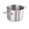 Kochtopf, niedrig, aus Edelstahl 18/10, seidenmatt gebürstet mit (bis Ø 32 cm hochglänzendem) Schüttrand, verkapselter Sandwichboden, induktionsgeeignet, handliche Vollprofil-Kaltgriffe mit Schutzplatten, extra schwere Qualität