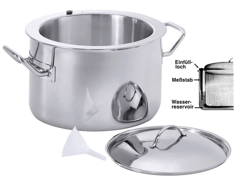 Simmertopf, groß, aus Edelstahl 18/10, matt poliert, mit Kompensboden und Ausgussschnaupe, induktionsgeeignet, komplett mit Einsatz 1405 und Deckel 2161