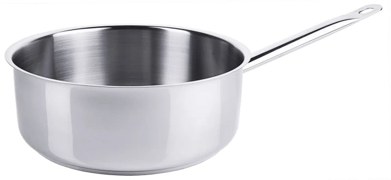 Stielkasserolle, mittelhoch, Sautoirform, aus Edelstahl 18/10, hochglänzend, mit Rohrgriff und Schüttrand, 8 mm Sandwichboden, induktionsgeeignet, schwere Qualität