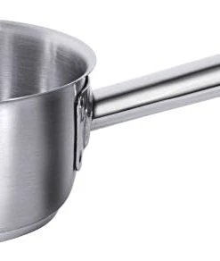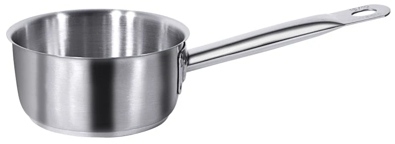 Stielkasserolle, hoch, aus Edelstahl 18/10, hochglänzend, mit Rohrgriff und Schüttrand, 8 mm Sandwichboden, induktionsgeeignet, schwere Qualität