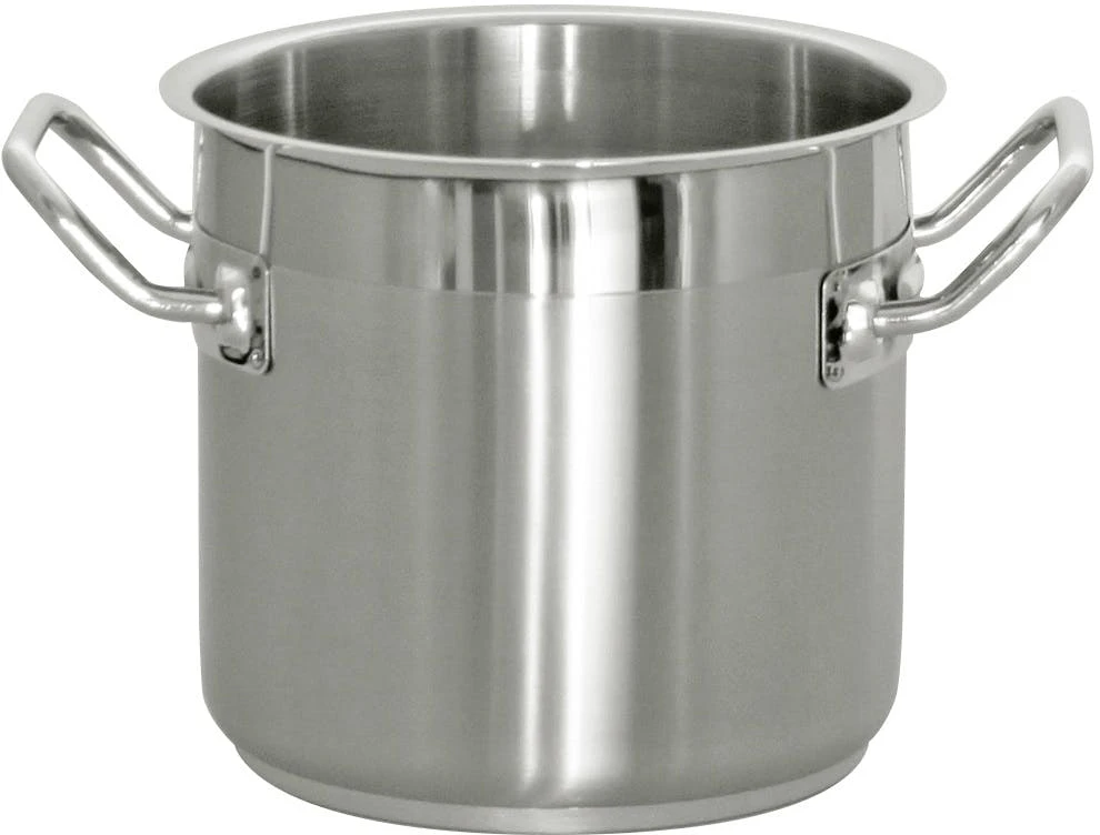 Kochtopf aus Edelstahl CNS 18/10 in absoluter Profi-Qualität. ++ satinierte Oberfläche ++ mehrfach punktgeschweißte Kalt-Griffe ++ 8mm Sandwitchboden (Edelstahl, Aluminium, magnetischer Stahl) ++ induktionsgeeignet ++ inkl. Schüttrand ++