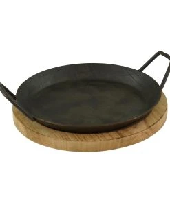 2 Stück Servierpfanne aus Schmiedeeisen mit zwei Seitengriffen und Brett ø 24cm