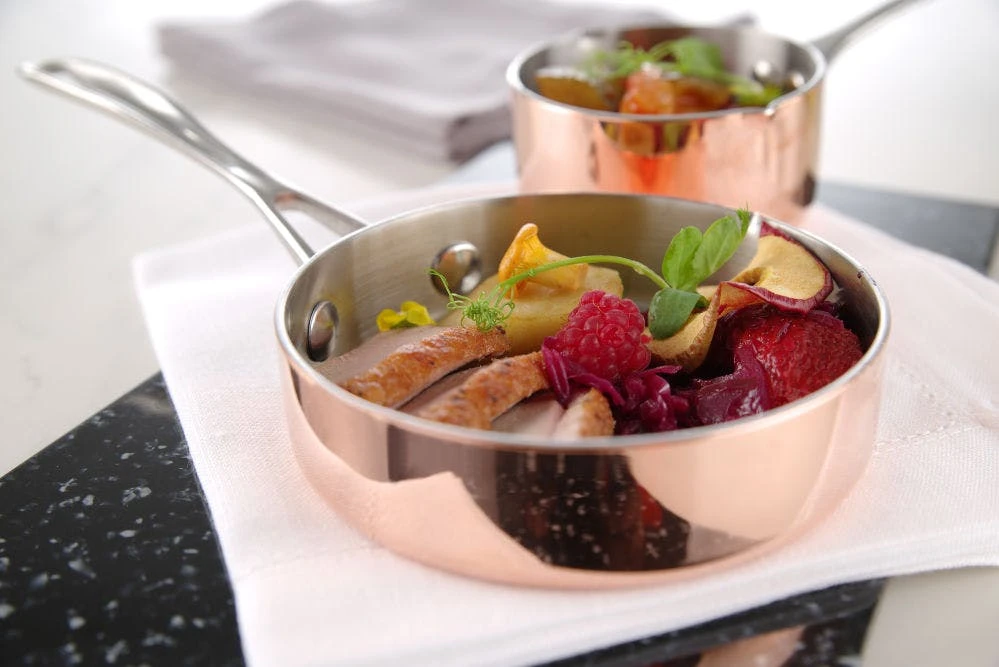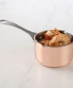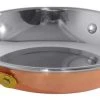 Aus 2,5 mm starkem 3-lagigem Material, Kupfer/Aluminium/Edelstahl. Der Griff ist mit Nieten befestigt.