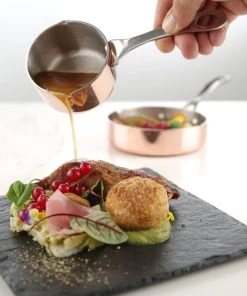 Aus 2,5 mm starkem 3-lagigem Material, Kupfer/Aluminium/Edelstahl. Der Griff ist mit Nieten befestigt.