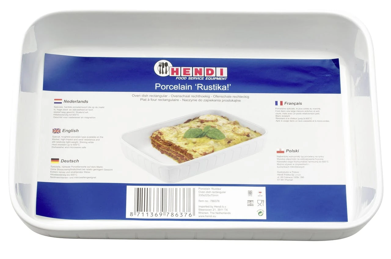 Die Hendi Rustica Ofenform misst 4 x 13 x 22 cm (B x T x H) und ist aus besonders robustem Porzellan gefertigt. Die ovale Ofenform ist sehr widerstandsfähig gegen Stöße, Abnutzung und Temperaturschwankungen. Außerdem ist sie auch spülmaschinenfest. Farbe: strahlend Weiß.