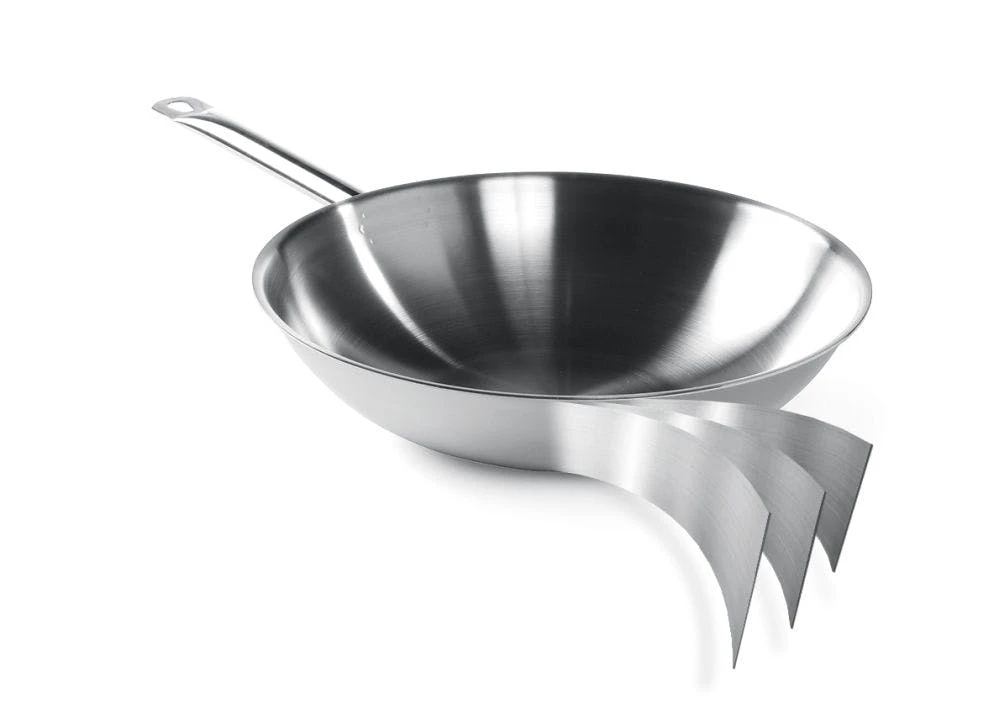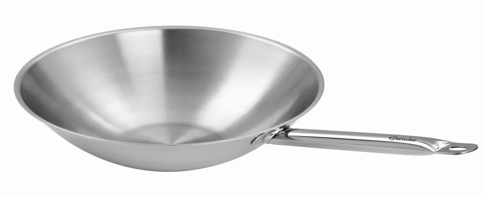 Wokpfanne • 3-Schicht Material: Aussenschicht CNS 18/10 (0,5mm), Zwischenschicht Aluminium (1,5mm), Innenschicht CNS 18/8 (0,4mm) vom Boden bis zum Rand. • Sehr schnelle Erhitzung und exzellente Hitzeverteilung. • Extrem Widerstandsfähig. • Langer Hohlgriff aus Edelstahl. • Abgeflachter Boden mit Ø 145 mm • Maße: Ø 360 x H 90 mm