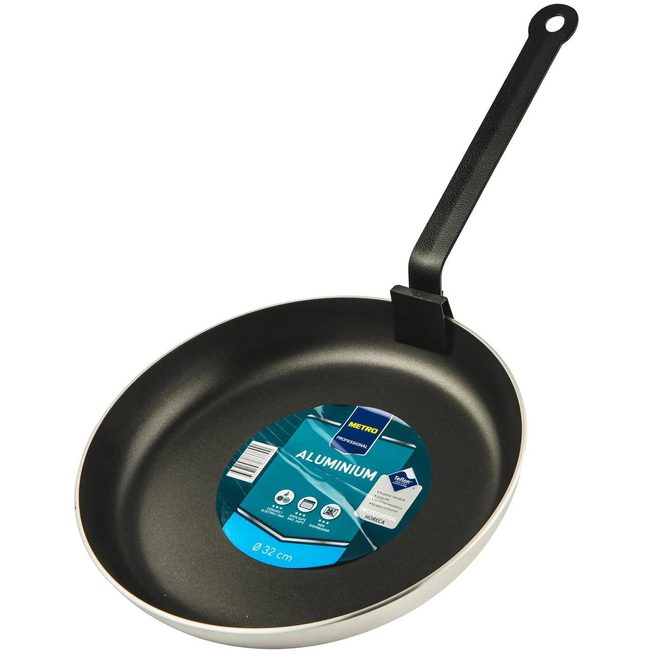 Die METRO Professional Bratpfanne aus Aluminium hat einen Durchmesser von 32 cm, eine Körperstärke von 3.6 mm und eine Höhe von 16.5 cm. Außerdem verfügt das Produkt über einen Stahlgriff und eine matierte Außenseite. Die Innenseite des Produkts ist mit einer dopelteTeflonbeschichtung versehen. Das Produkt ist backofenfest und für Elektro-, Keramik- und Gasherde geeignet.