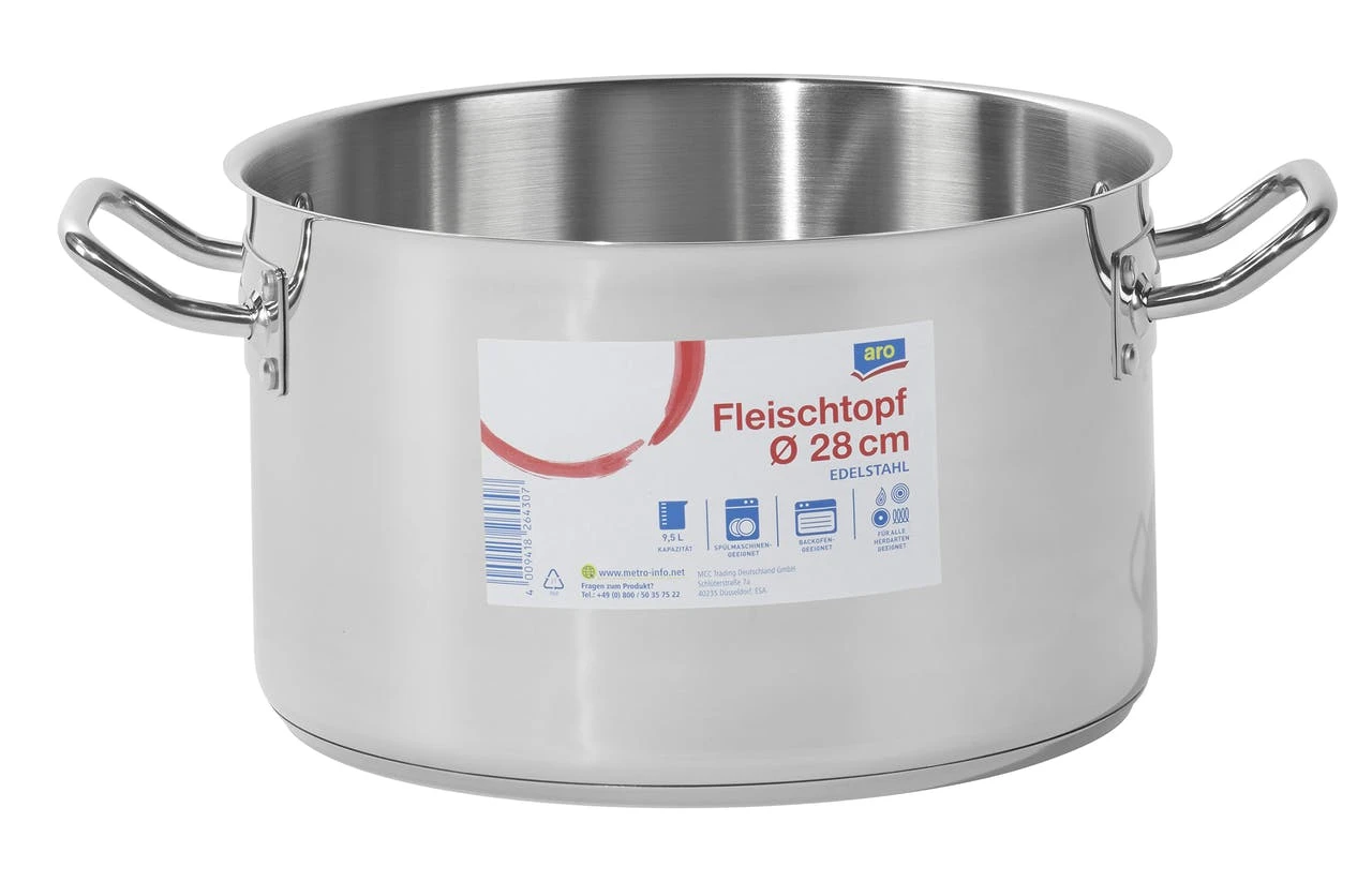 Der METRO Professional Edelstahlfleischtopf hat einen Durchmesser von 36 cm. Das Produkt hat eine Höhe von 22 cm, eine Dicke von 1 mm und einen 4 mm Aluminium-Sandwichboden mit Induktionsboden. Außerdem verfügt das Produkt über einen Edelstahlgriff und eine satinierte Außenseite aus Edelstahl 304. Der Topf ist für Elektro-, Gas-, Glaskeramik- und Induktionsherde geeignet.