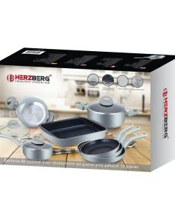 Haben Sie genug von Ihrem alten Kochgeschirr? Lernen Sie das neue und revolutionierte Kochgeschirr aus der Herzberg Cooking-Linie kennen. Das 10-teiliges marmorbeschichtetes Kochgeschirr-Set, ist ein komplettes Kochgeschirr-Set für Ihren täglichen Kochbedarf. Dieses Kochgeschirr besteht aus strapazierfähigem, ungiftigem, hartanodisiertem Aluminium in Lebensmittelqualität. Perfekt für eine ausgewogene Wärmespeicherung. Die Außenseite aus Aluminium ist dicht und sehr verschleißfest. Es verfügt über eine langlebige Marmor-Antihaftbeschichtung, die frei von PFAS, PFOA, Blei und Cadmium ist und verzugsfrei ist. Diese Marmorbeschichtung ist korrosions- und kratzfest, reagiert nicht auf säurehaltige Lebensmittel, hält dem täglichen Gebrauch stand und sorgt dafür, dass Lebensmittel reibungslos über die Oberfläche gleiten, wodurch das Kochen und die Reinigung zum Kinderspiel werden. Das Äußere des Kochgeschirrs ist mit einer hochtemperaturbeständigen Emaille beschichtet, wodurch es weniger anbrennt oder seine Farbe ändert, sowie langlebiger und einfacher zu reinigen ist. Vernietete Silikongriffe sorgen für Komfort und Sicherheit, während belüftete gehärtete Glasdeckel für Sichtbarkeit sorgen und gleichzeitig genügend Wärme und Feuchtigkeit für optimale Ergebnisse speichern. Das Kochgeschirr ist mit einem flachen Induktionsboden ausgestattet, der ein gleichmäßiges Platzieren über der Hitzequelle ermöglicht und für alle Herdarten geeignet ist. Kann sicher in Spülmaschinen verwendet werden.