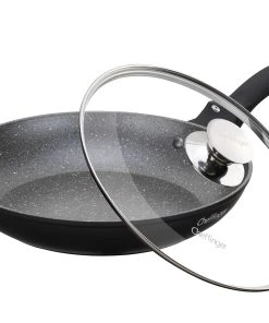 Die Pfanne besteht aus geschmiedetem Aluminium und hat eine 3-lagige Marmorbeschichtung. Es kann für alle Arten von Wärmequellen verwendet werden. Der mitgelieferte Deckel besteht aus gehärtetem Glas und hat einen Edelstahlknopf.