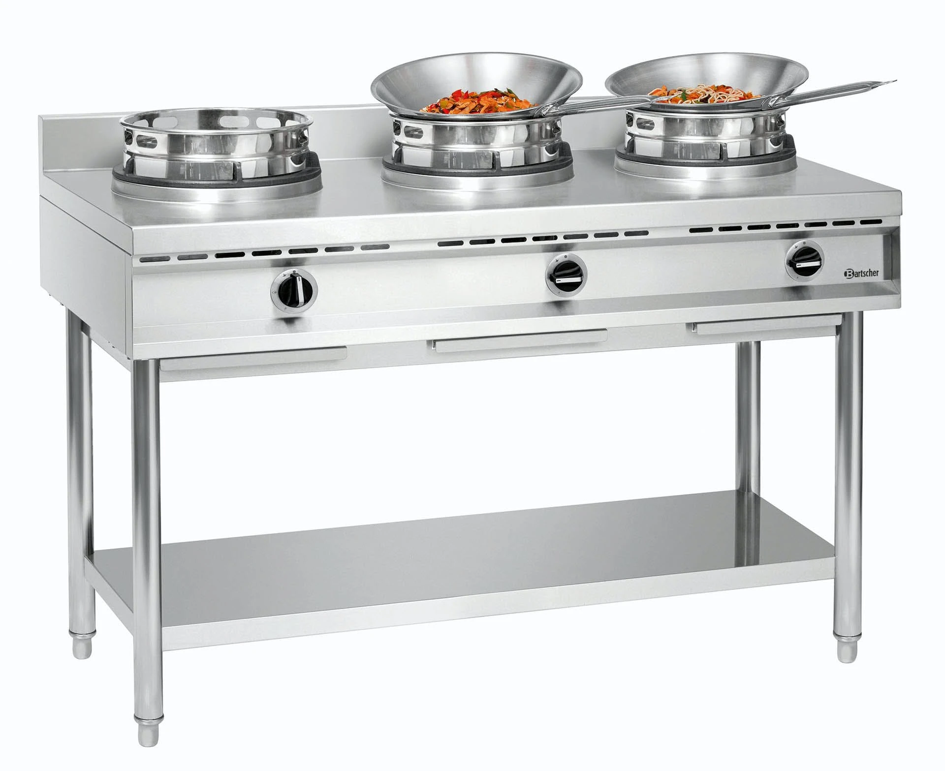 Gas-Wokherd GWH33 Hochleistungs-Brenner à 11,5 kW, manuelle Zündung3 abnehmbare Wokringaufsätze, Ø 290 mm innenKochstellen ohne Wokringaufsatz: für Töpfe ab Ø 200 mmUnterbau mit höhenverstellbaren FüßenAnschlusswert: 34,5 kWMaße: B 1500 x T 600 x H 960 mmGewicht: 85 kgGTIN 4015613610771