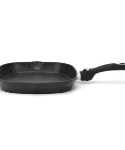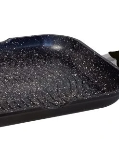 Die aus Aluminiumdruckguss hergestellte Pfanne hat eine dreischichtige Marmorbeschichtung und zwei Gießlöcher, um überschüssiges Fett leicht abzugießen. Er kann für alle Arten von Wärmequellen verwendet werden. Der Griff bleibt während des Kochens kühl und ist zur einfachen Aufbewahrung und Reinigung abnehmbar. Der mitgelieferte Deckel besteht aus gehärtetem Glas und hat einen Edelstahlknopf.