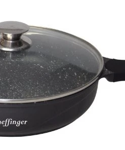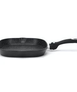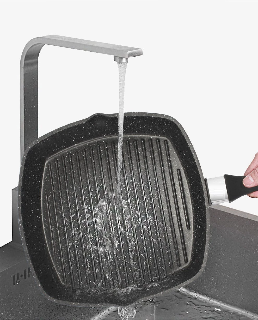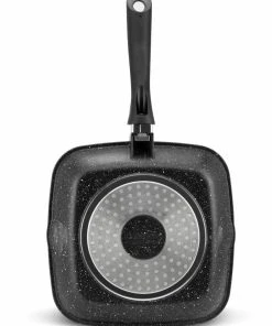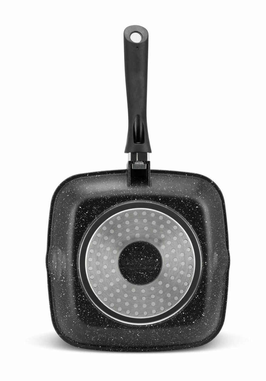 Die aus Aluminiumdruckguss hergestellte Pfanne hat eine dreischichtige Marmorbeschichtung und zwei Gießlöcher, um überschüssiges Fett leicht abzugießen. Er kann für alle Arten von Wärmequellen verwendet werden. Der Griff bleibt während des Kochens kühl und ist zur einfachen Aufbewahrung und Reinigung abnehmbar.