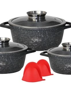 Mit diesem 6- Geschirrset können Sie die köstlichsten Gerichte zubereiten. Das Set besteht aus drei Töpfe mit Deckel. Die Töpfe sind aus Aluminium Guss gefertigt und mit einer 3-Schicht-Marmorbeschichtung versehen. Sie können für alle Arten von Wärmequellen verwendet werden.