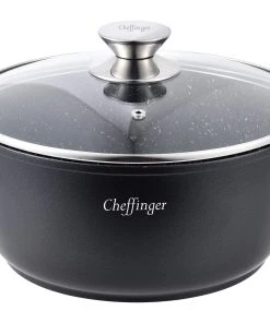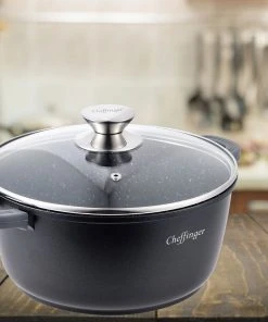 Es besteht aus Aluminiumguss und hat eine 3-schichtige Marmorbeschichtung und abnehmbare Silikongriffe. Es kann auf alle Arten von Wärmequellen verwendet werden und es kann auch im Ofen bis 240 Grad eingesetzt werden. Der mitgelieferte Deckel besteht aus gehärtetem Glas und es hat einen Edelstahlknopf