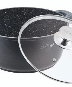 Es besteht aus Aluminiumguss und hat eine 3-schichtige Marmorbeschichtung und abnehmbare Silikongriffe. Es kann auf alle Arten von Wärmequellen verwendet werden und es kann auch im Ofen bis 240 Grad eingesetzt werden. Der mitgelieferte Deckel besteht aus gehärtetem Glas und es hat einen Edelstahlknopf