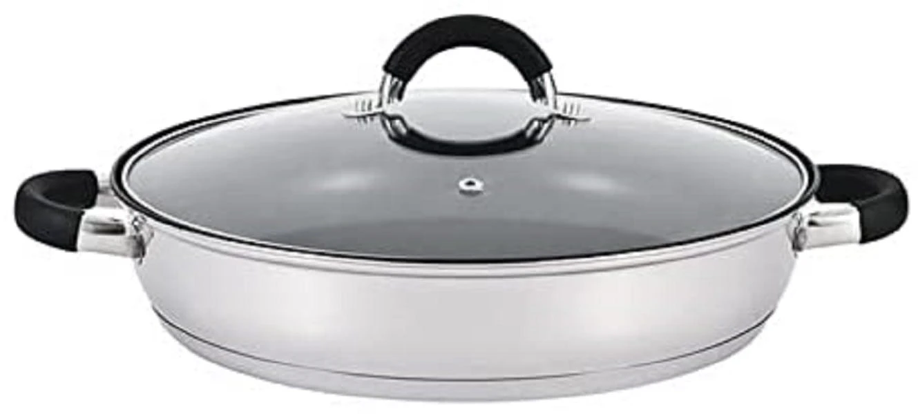 Eine Michelino Pfanne aus rostfreiem Edelstahl, die Dank der zwei Griffe auch als Servierpfanne gut zum Einsatz kommt.