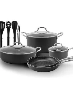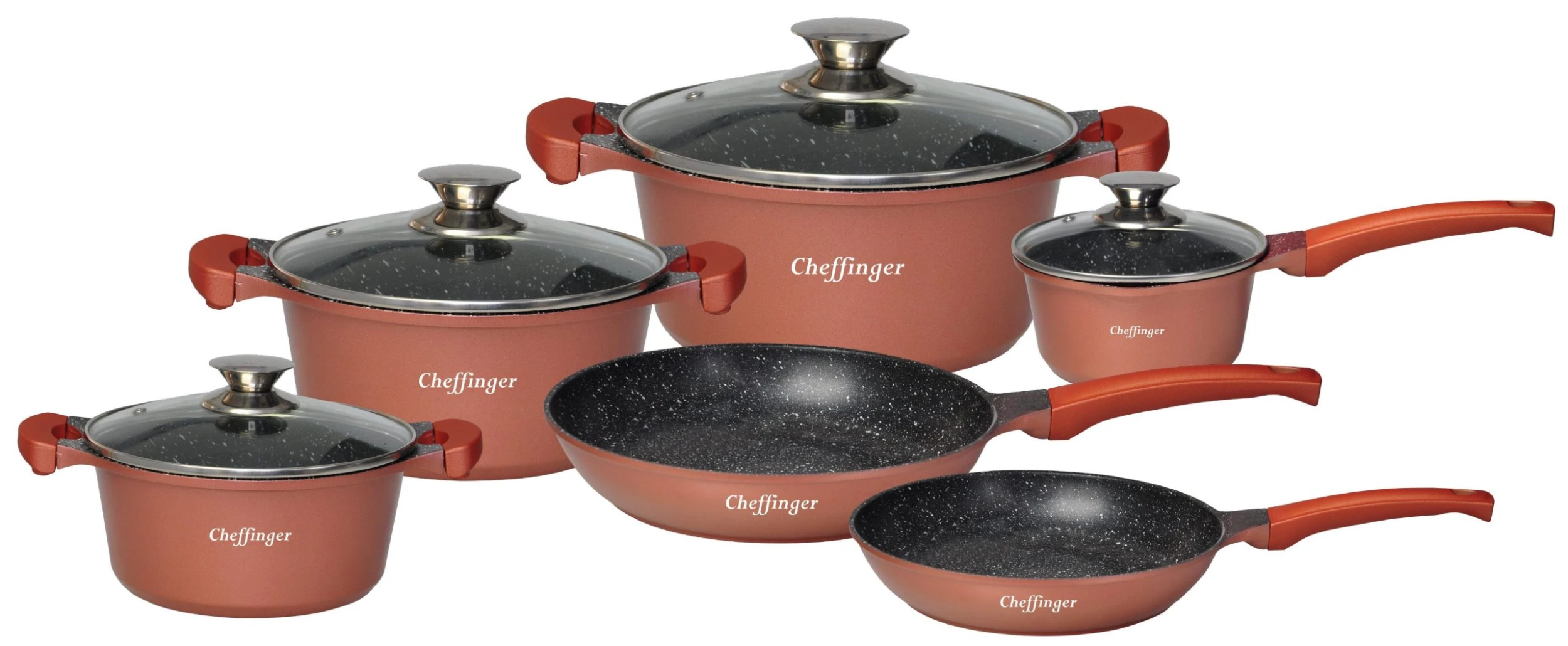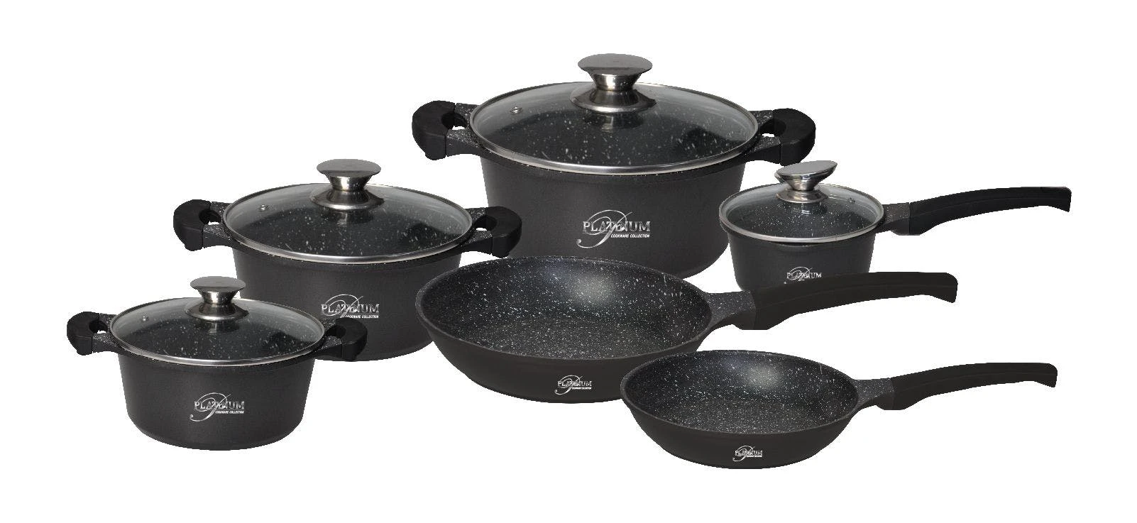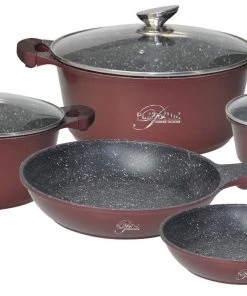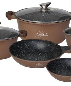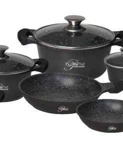 Mit diesem 6-teiligen Geschirrset können Sie die köstlichsten Gerichte zubereiten. Das Set besteht aus drei Töpfe mit Deckel, Die Töpfe sind aus Aluminium Guss gefertigt und mit einer 3-Schicht-Marmorbeschichtung versehen. Sie können für alle Arten von Wärmequellen verwendet werden.
