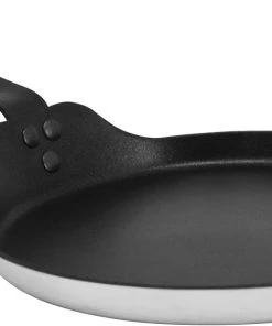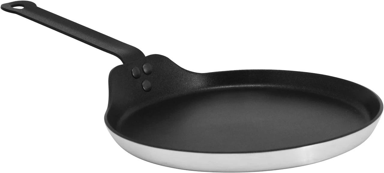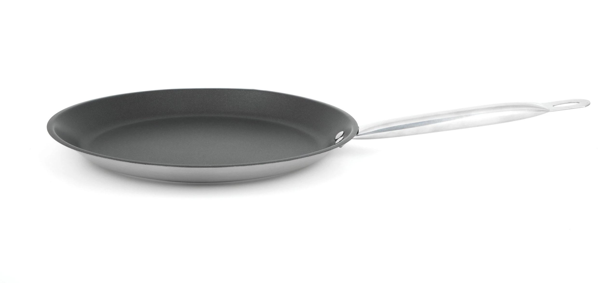 Die Stalgast Crepes-Pfanne aus Aluminium mit einer Teflonbeschichtung hat einen genieteten Flachstiel aus Stahl und einen Durchmesser von 292/255 mm.
