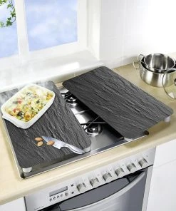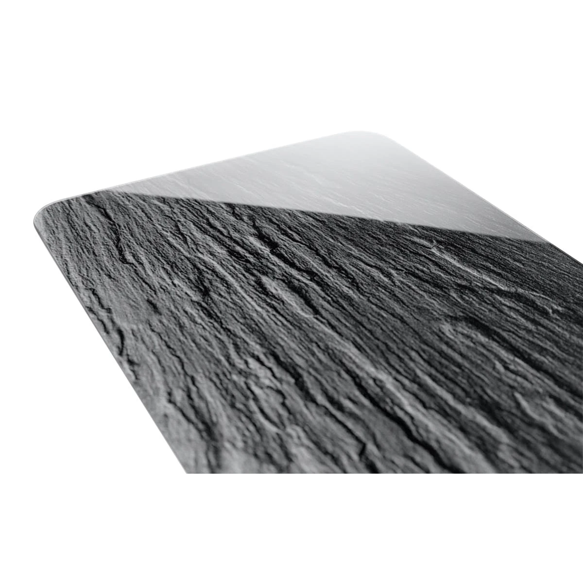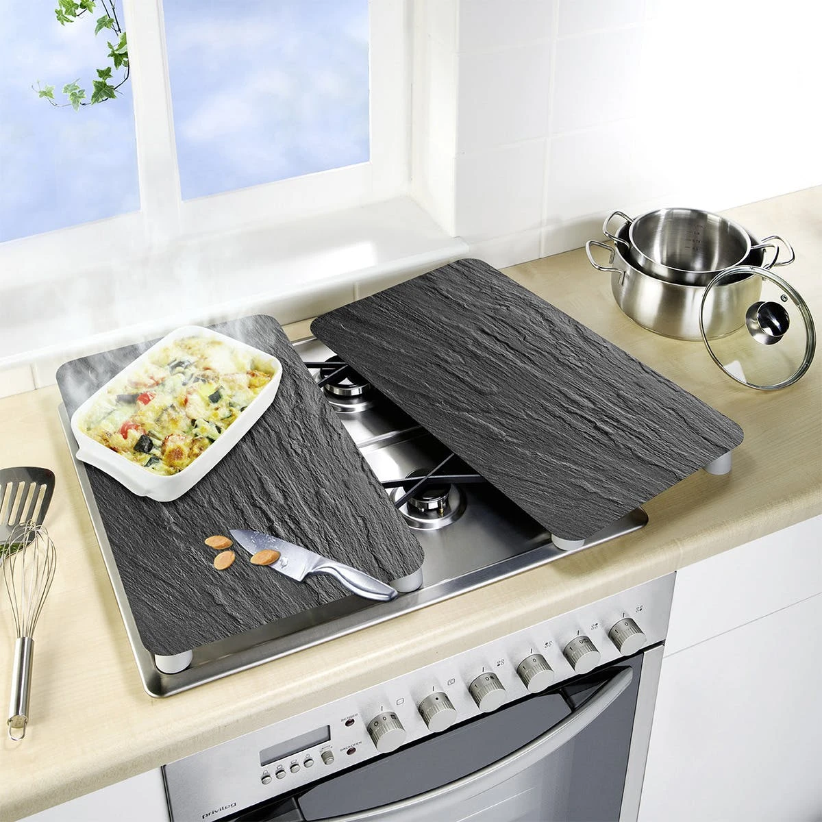 Dieses zweier Glas-Abdeckplatten-Set mit dem schroffen Schiefer-Design bringt eine individuelle Atmosphäre in die Küche und sorgt für zusätzliche Funktionalität des Herdes. Die Abdeckplatten schützen den Herd zuverlässig. Ob Glaskeramik-, Elektro- oder Gasherd die acht rutschfesten Spezialfüße gewährleisten stets den nötigen Abstand (verstellbar bis 5 cm Höhe). Die Herdabdeckplatten eignen sich zum Abstellen von warmen Töpfen und Pfannen. Ebenso können sie als zusätzliche Erweiterung der Arbeitsfläche zur Vorbereitung von Speisen dienen. Ihre kratzfeste, porenfreie Oberfläche wird höchsten hygienischen Ansprüchen gerecht, da sie das Einnisten von Bakterien und Gerüchen verhindert. Die Platten sind extrem robust und nahezu unzerbrechlich (schlagfest).